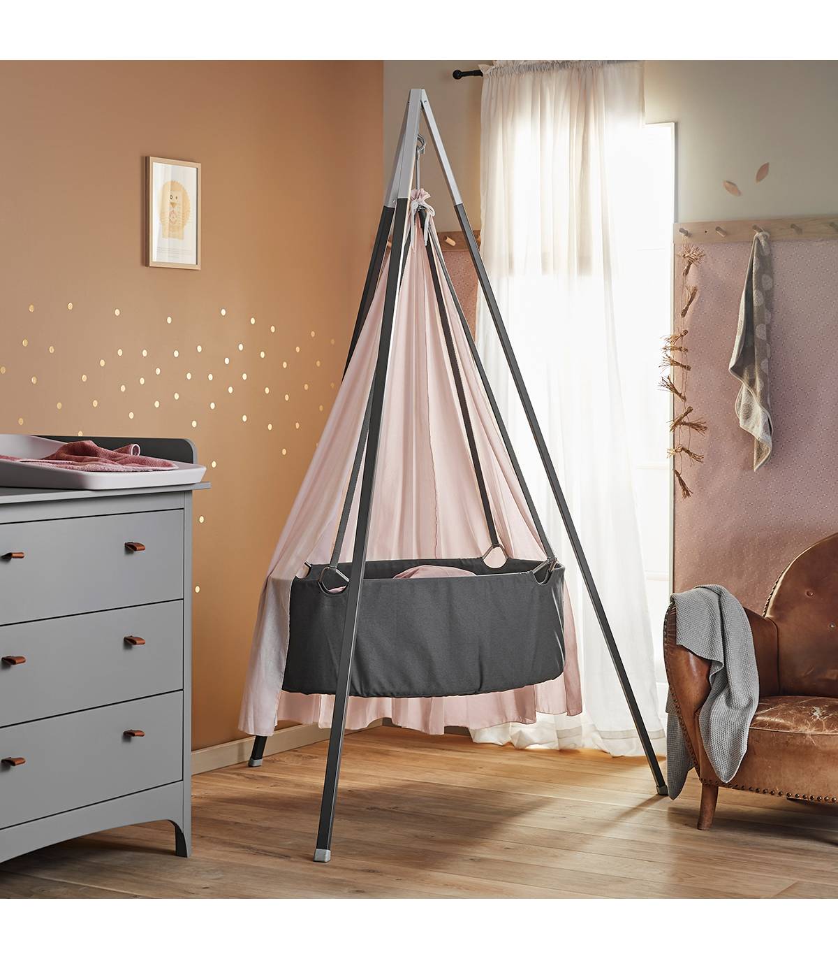 Der schöne, luftige Betthimmel hüllt die Leander Wiege auf wunderschöne Art ein. Der Himmel bietet Ihrem Kind Schutz und Geborgenheit.
